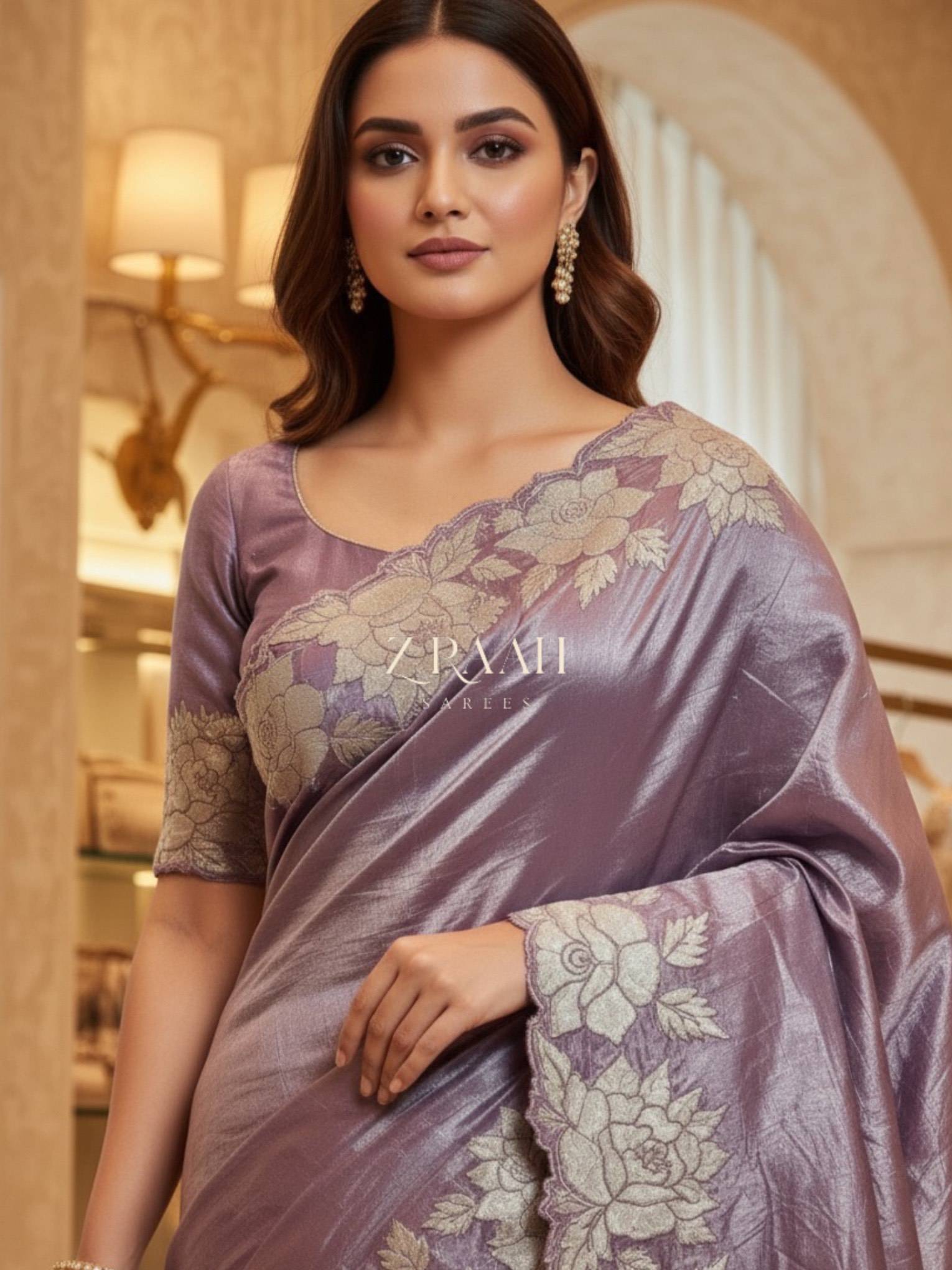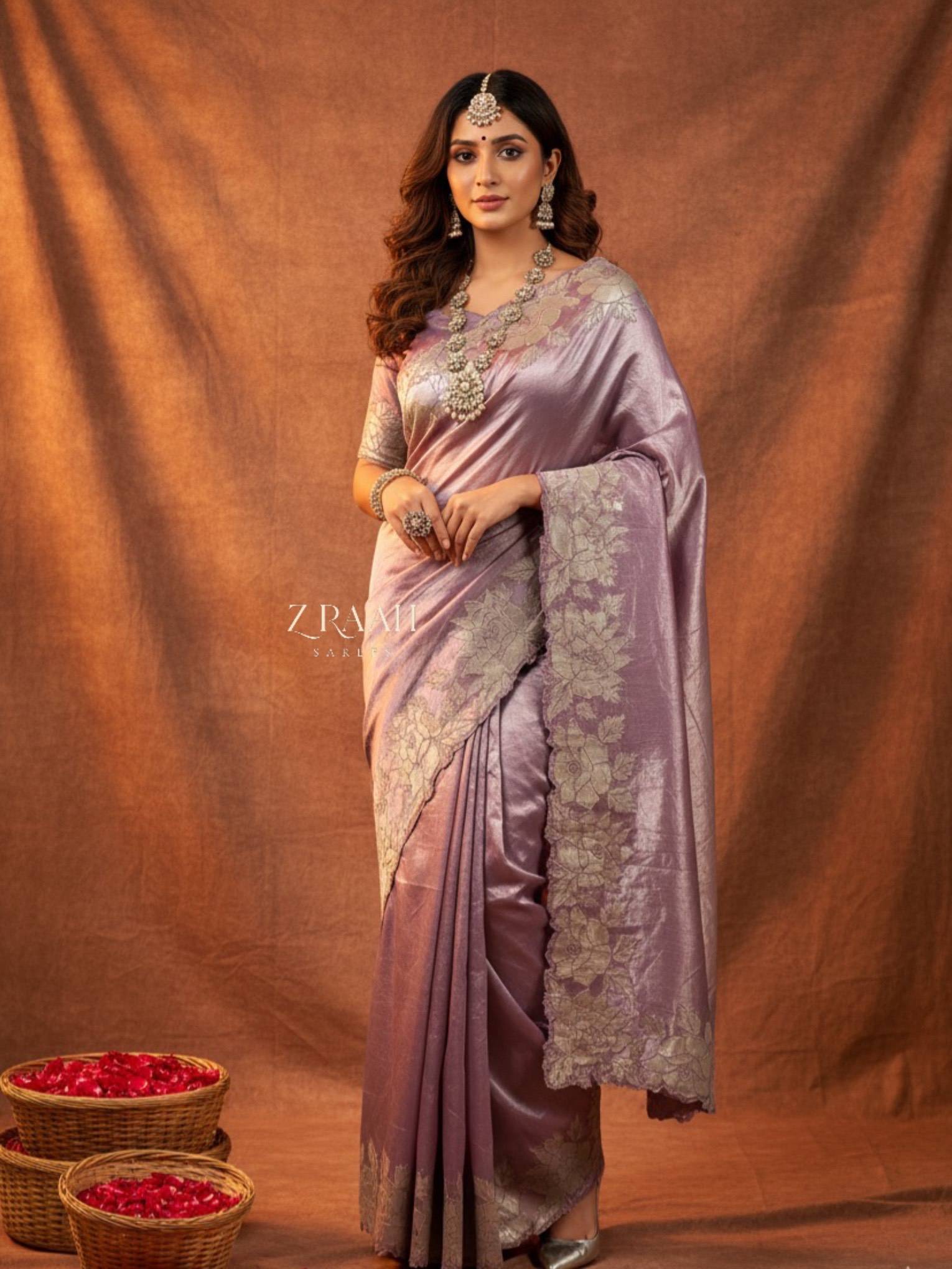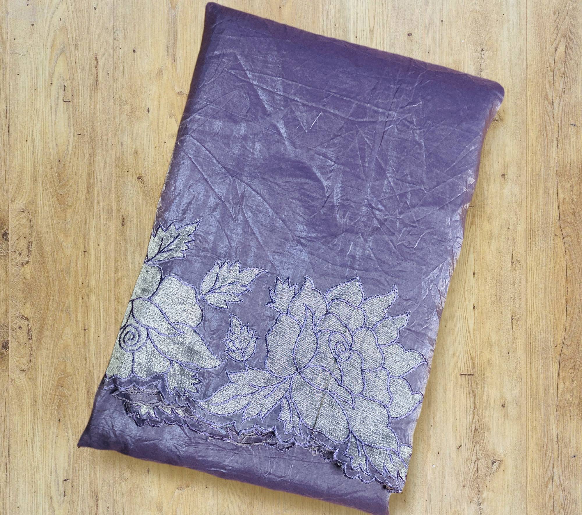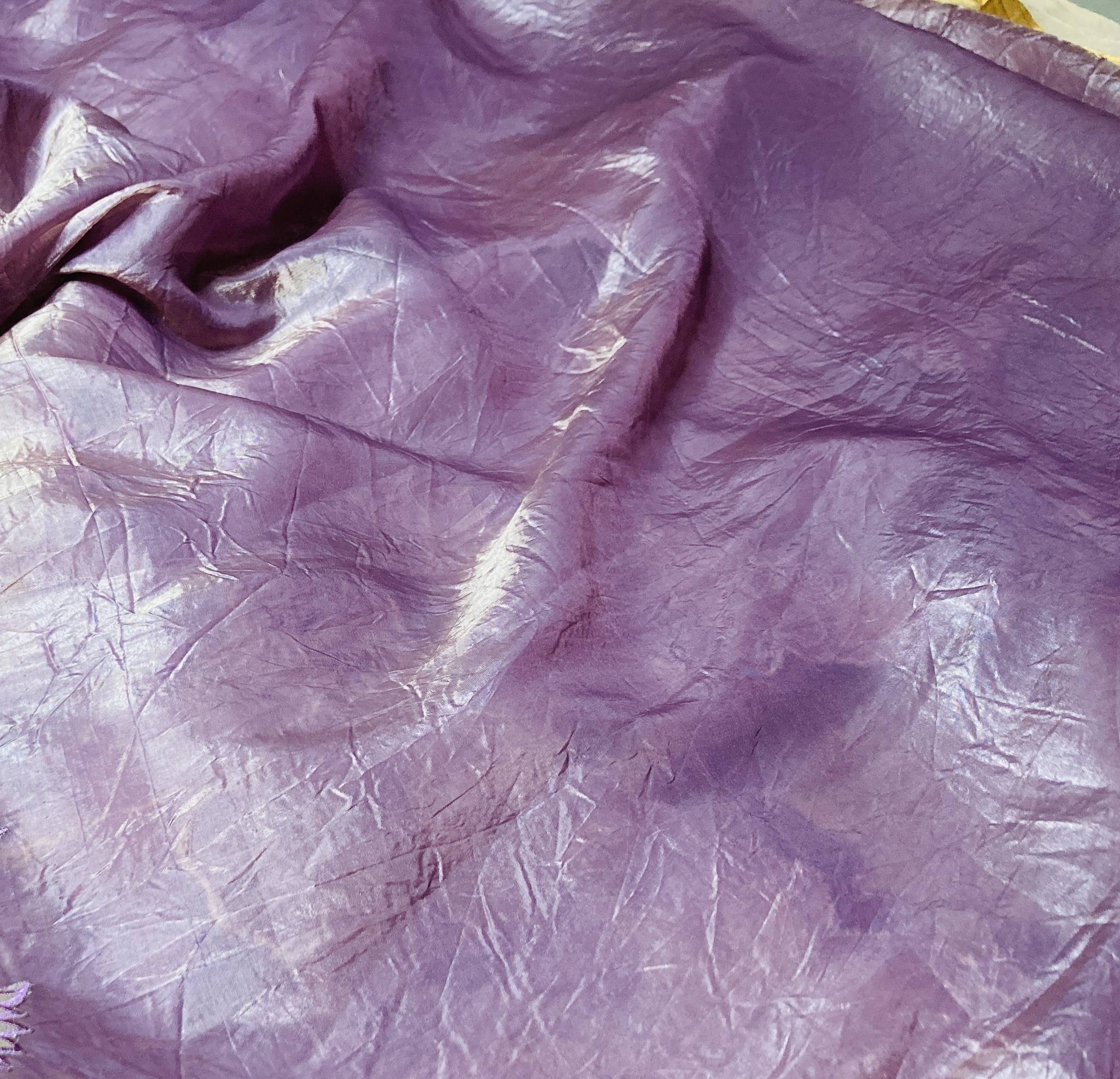 PREMIUM CRYSTAL TISSUE SAREE WITH RUNNING BLOUSE / SAREE BORDER IN FLORAL APPLIQUE FINISHING/SOFT LAVENDER PINK TONE WITH A METALLIC SHEEN