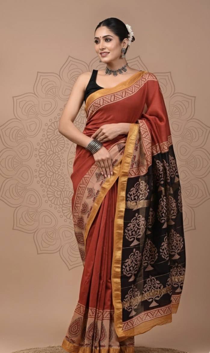 HAND BLOCK PRINTED MAHESHWARI SILK SAREE WITH BLOUSE PIECE