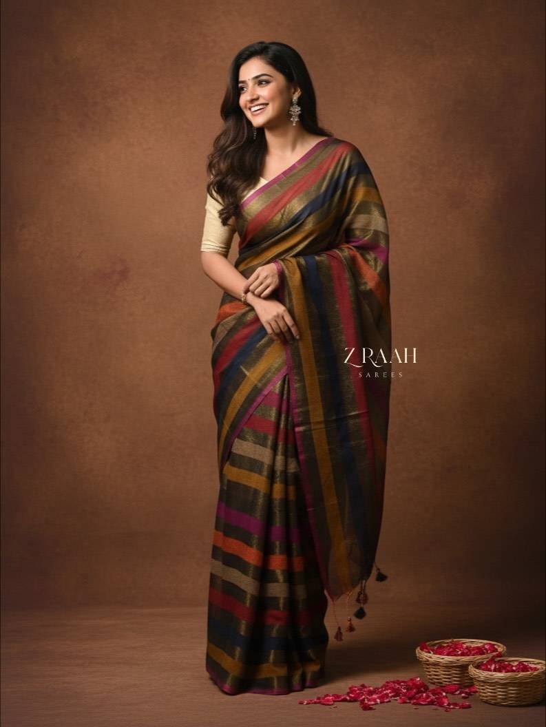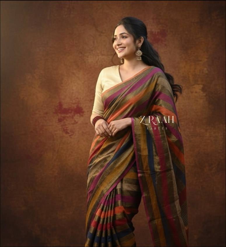 Elevate your ethnic wardrobe with our exquisite Khadi Cotton Multicolor Striped Saree. Measuring at a generous length of 5.50 meters, this saree blends traditional aesthetics with contemporary style, perfect for any occasion.