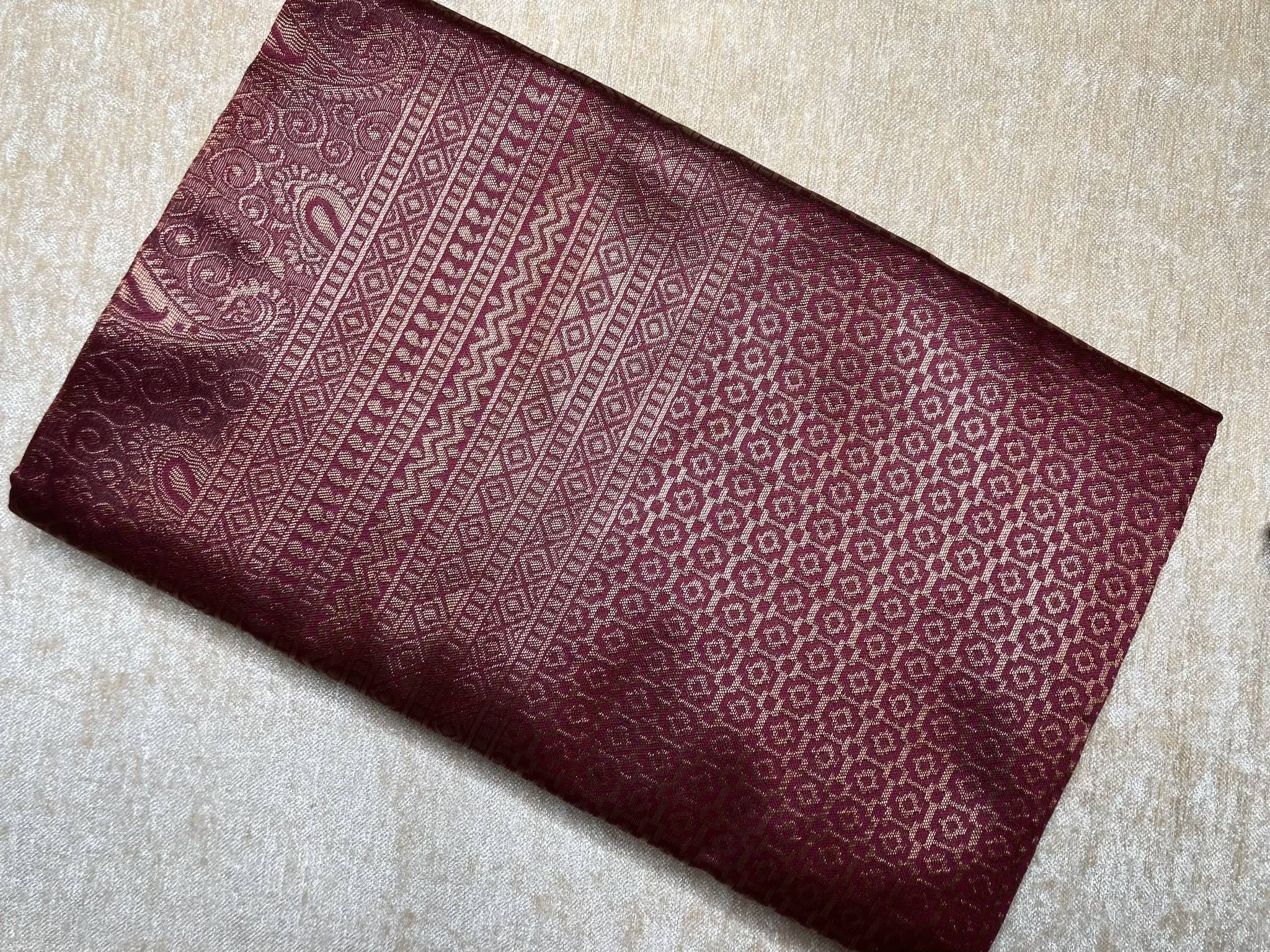 Elevate your ethnic wardrobe with our exquisite Lichi Silk Saree, featuring intricate jacquard weaving that showcases stunning patterns and designs, perfect for both festive occasions and everyday elegance. This maroon-toned saree is beautifully adorned with rich golden zari work, adding a touch of opulence and sophistication.