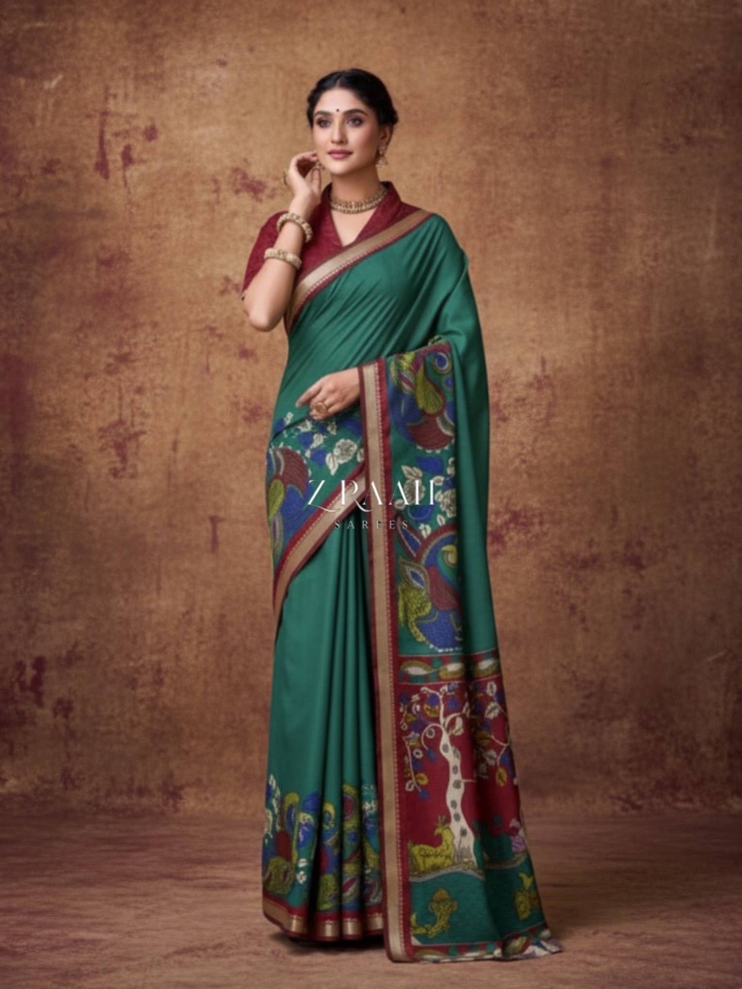 Embrace sophistication and style with this elegant saree that comes complete with a matching blouse piece. Elevate your fashion statement with our Designer Saree that truly embodies the artistry of traditional Kalamkari.