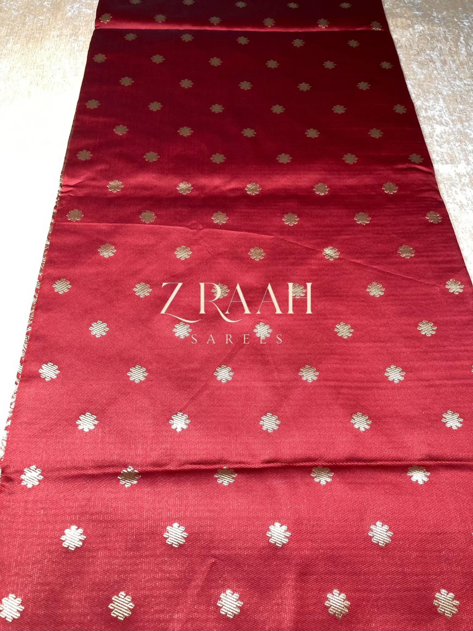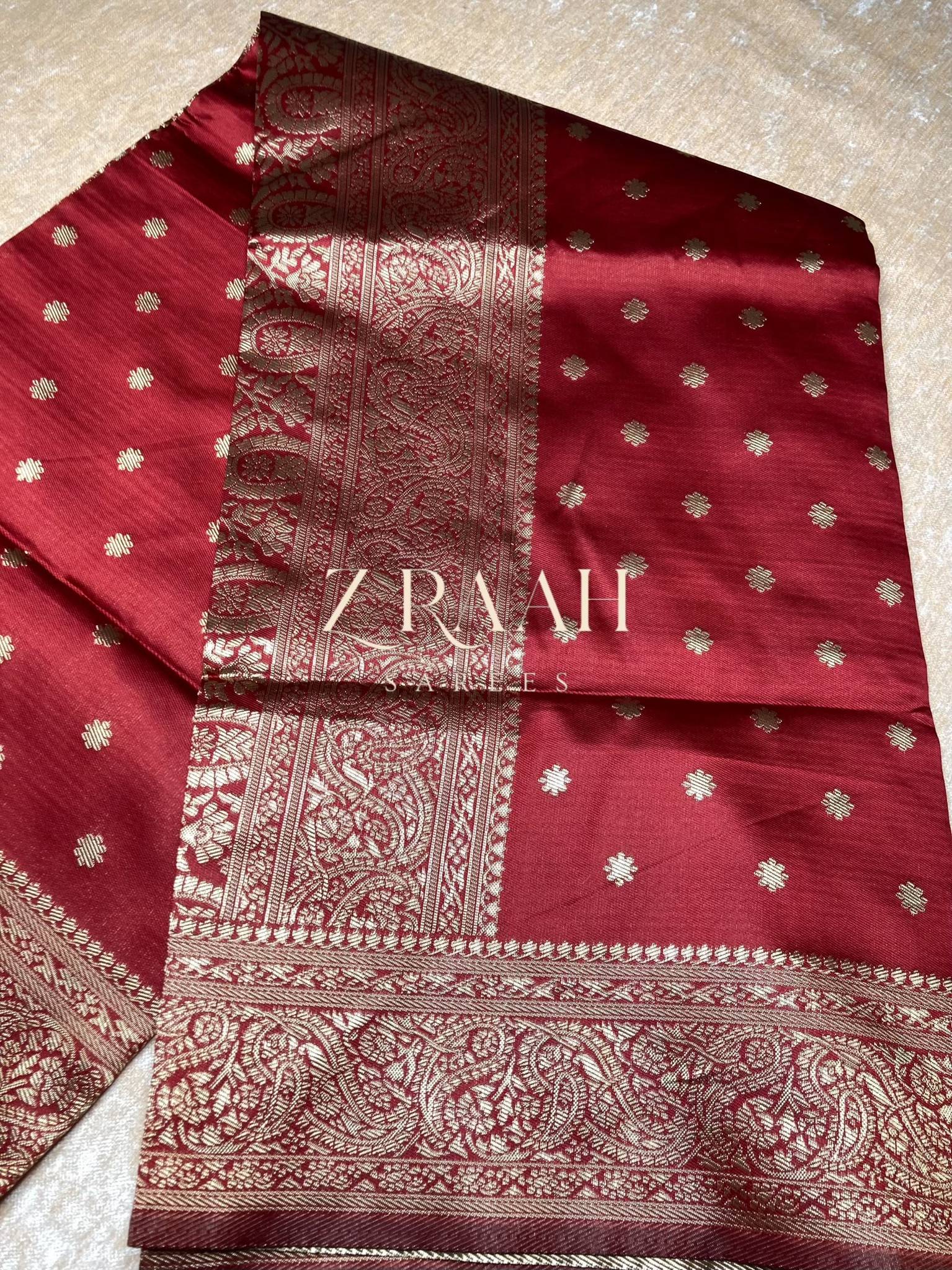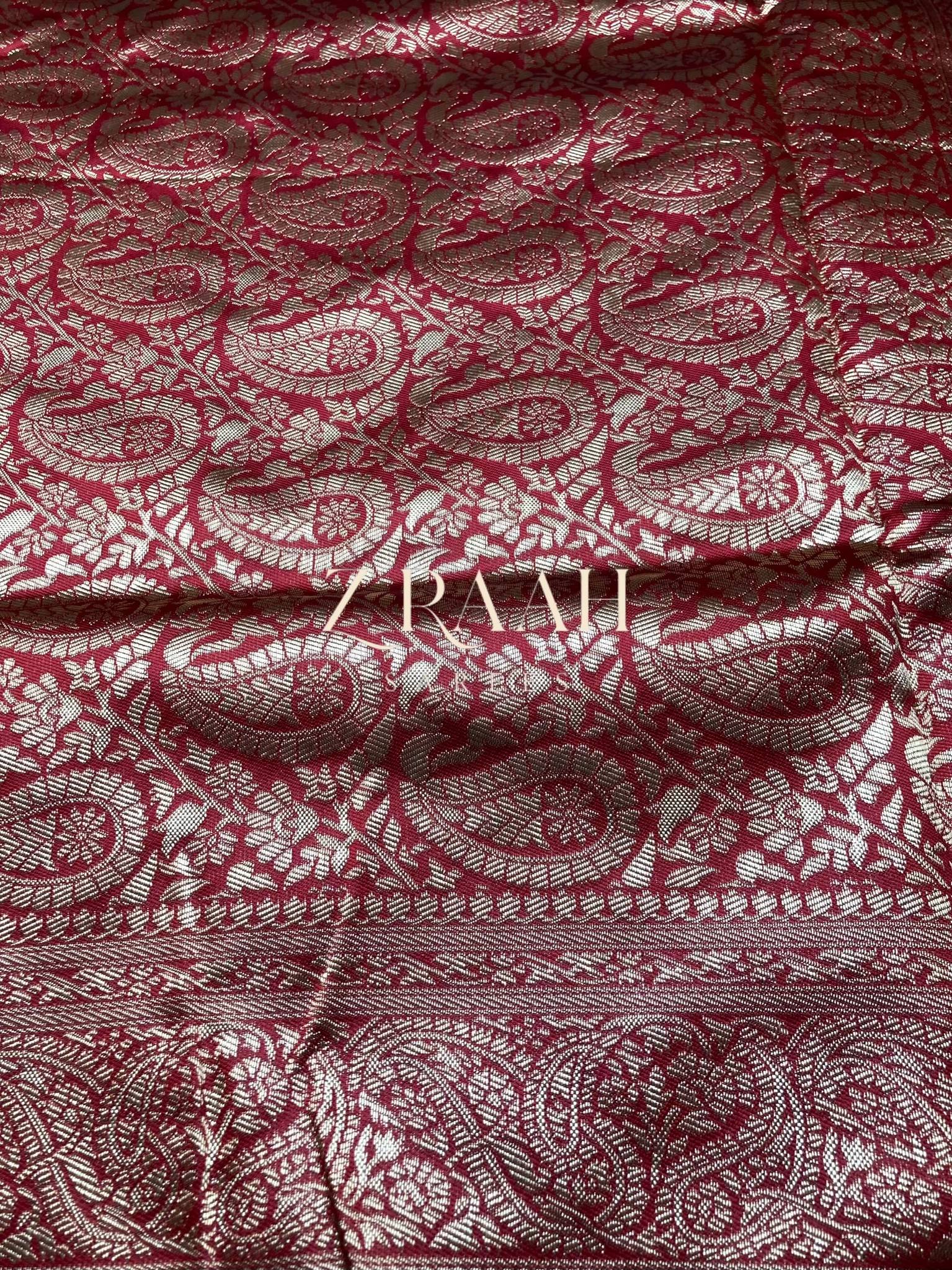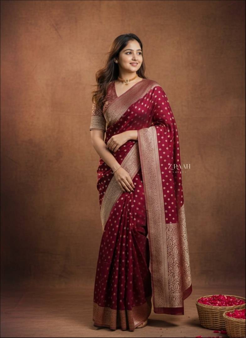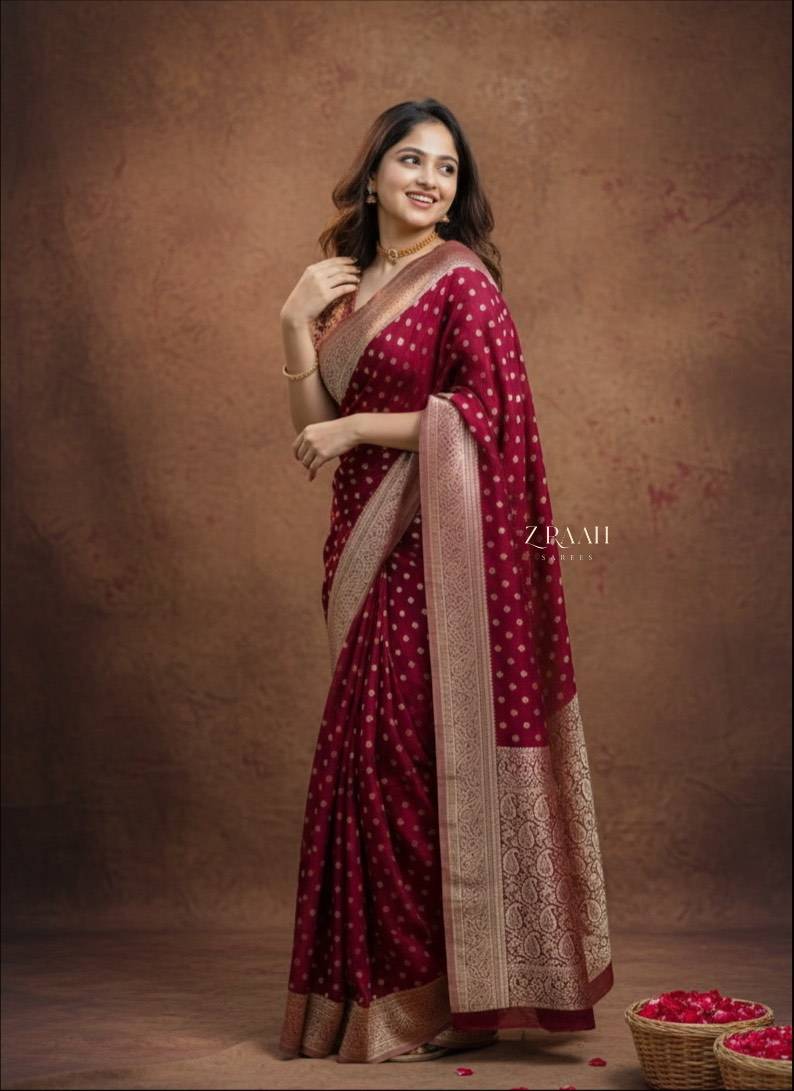 The accompanying blouse is equally exclusive, featuring detailed jacquard work that complements the saree beautifully. Whether you're attending a wedding, festival, or formal event, this saree is the ultimate choice for a graceful and stylish appearance.