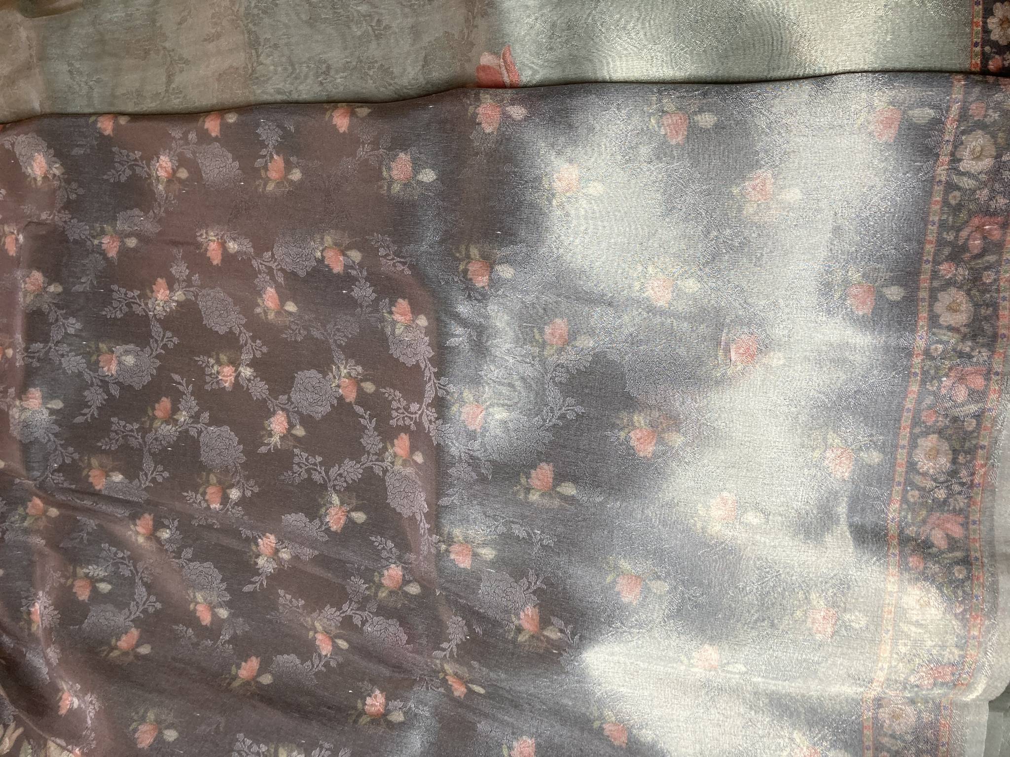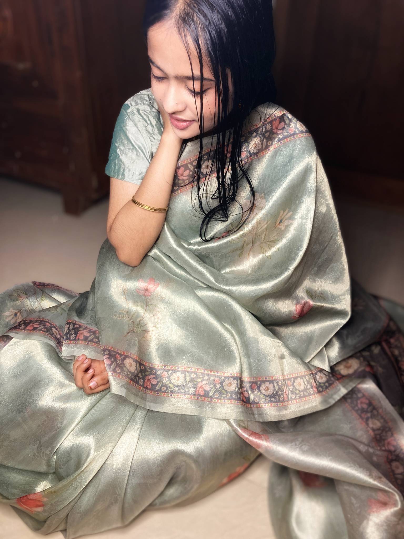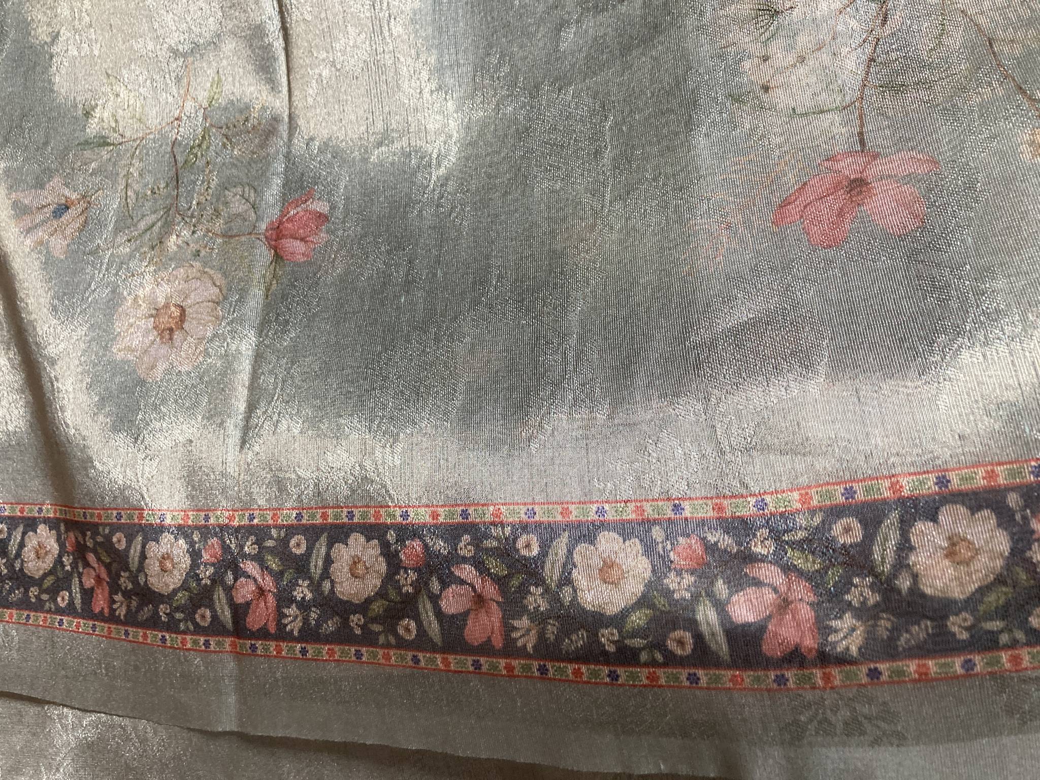 TISSUE SILK SAREE IN SILVER UNDERTONE AND PASTEL SAGE GREEN TONE & FLORAL PRINTED BORDERS WITH RUNNING BLOUSE