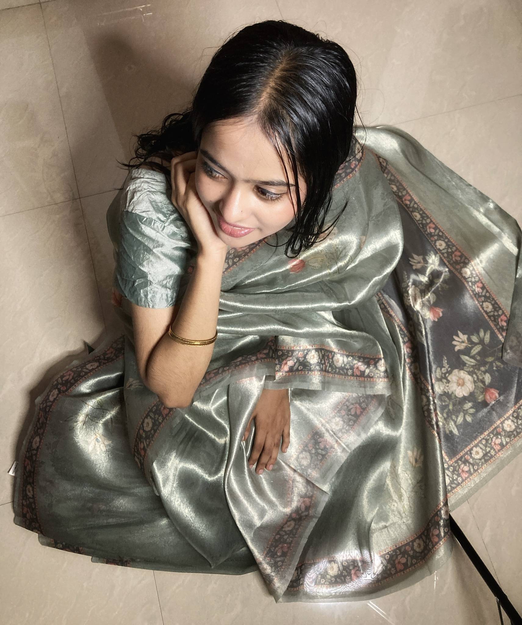 Discover the exquisite beauty of our Tissue Silk Saree, featuring a stunning silver undertone that beautifully complements the soft pastel sage green floral printed borders. This elegant saree is perfect for various occasions, offering both comfort and a touch of sophistication.